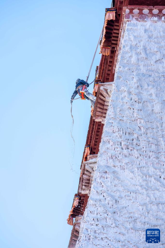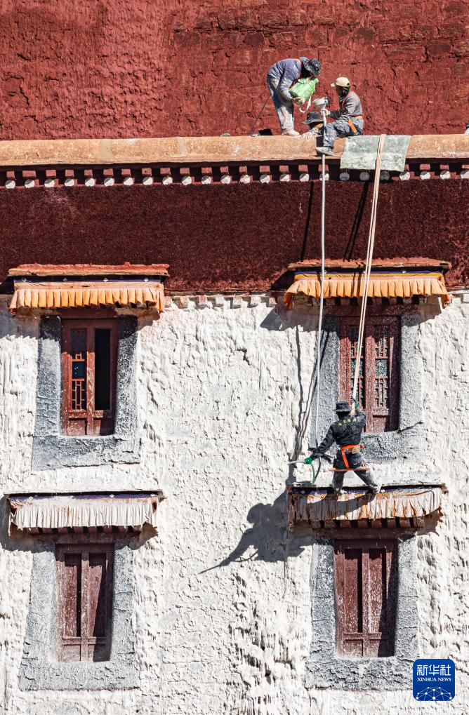 10月28日,布達(dá)拉宮管理處的工作人員在噴灑涂料。新華社記者 旦增尼瑪曲珠 攝