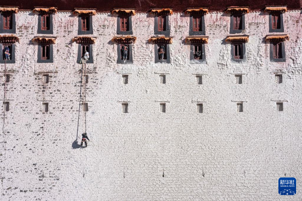 近期,西藏布達(dá)拉宮開(kāi)始進(jìn)行一年一度的外墻粉刷工作。布達(dá)拉宮管理處的工作人員和志愿者一起,將牛奶、蜂蜜、白糖、紅糖、藏紅花等粉刷原料與各色石灰混合后,調(diào)出白色、紅色、黃色的專用涂料,再噴灑到布達(dá)拉宮外墻上,因此布達(dá)拉宮也被人們稱為“甜蜜的宮殿”。獨(dú)特配方的涂料更具黏性而且不易脫落,從而更好地保護(hù)古建墻體。
