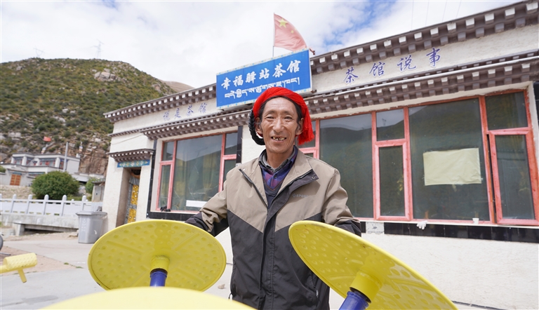 圖為怎村村民索朗塔杰在村幸福驛站茶館健身。記者 劉斯宇 攝