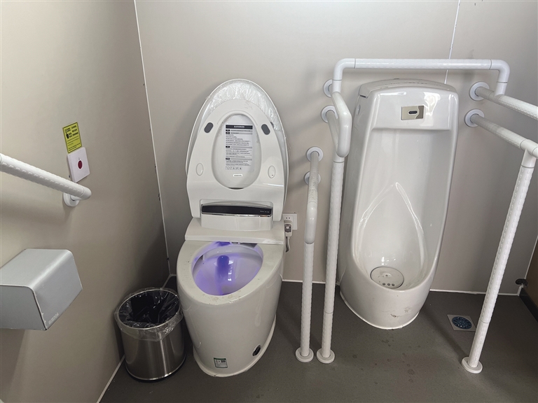 公廁內(nèi)部除了正常的蹲位,還設(shè)有第三衛(wèi)生間。第三衛(wèi)生間內(nèi)配有嬰兒護(hù)理臺(tái)、嬰兒安全座椅等設(shè)施。除此之外,第三衛(wèi)生間還設(shè)有安全扶手、智能馬桶等設(shè)備,方便腿腳不方便的老年人及殘疾人。智能馬桶旁還安裝有緊急報(bào)警器?!叭绻欣先嗽趲?,就可以按一下緊急報(bào)警器。這也是我們考慮到殘疾人、老年人如廁不方便,增設(shè)的人性化設(shè)計(jì)?!背嗔姓f。