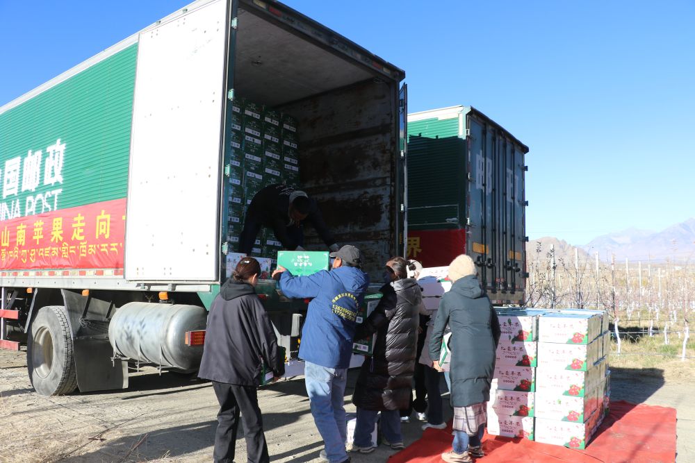 山南市扎囊縣矮化蘋(píng)果種植基地工作人員正在裝車(chē)。(山南市委宣傳部供圖)