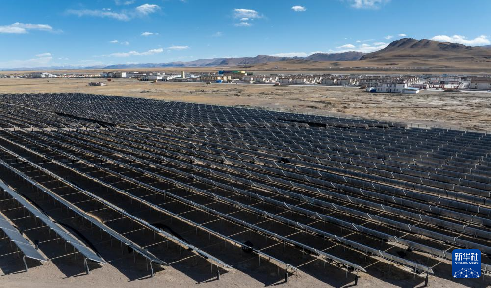 鳥瞰措勤縣城區(qū)清潔能源集中供暖特許經(jīng)營項(xiàng)目的光伏陣列(無人機(jī)照片,11月20日攝)。新華社記者 姜帆 攝
