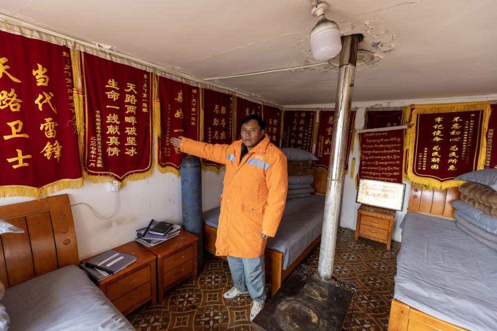 這里的救助站吸引了記者的注意。進(jìn)入房間,內(nèi)有床鋪、氧氣瓶、抗高反藥等物品,四面墻上掛滿錦旗。一封毛筆書(shū)寫的紅底感謝信格外顯眼,信中表達(dá)了對(duì)地嘎、東力、次仁多吉三名養(yǎng)路工人的感謝。信中寫道:“在那漫長(zhǎng)的10個(gè)小時(shí)里,你們不顧危險(xiǎn)和疲憊,想盡辦法讓我脫險(xiǎn)?!?/p>