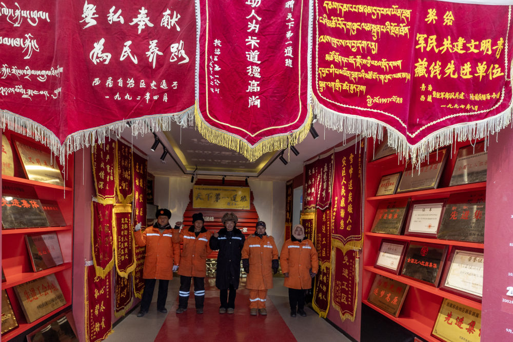 養(yǎng)路工人在“天下第一道班”紀(jì)念館內(nèi)合影(12月1日攝)。新華社記者 姜帆 攝