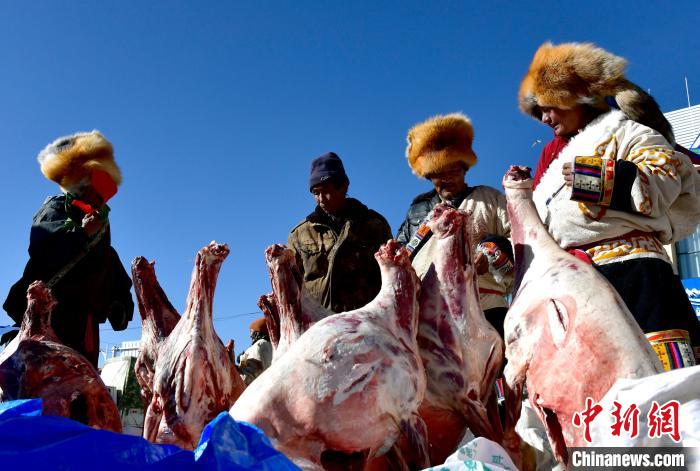 12月6日,西藏自治區(qū)那曲市申扎縣第十八屆畜產(chǎn)品展銷會現(xiàn)場,牧民整理售賣的羊肉?!±盍?攝