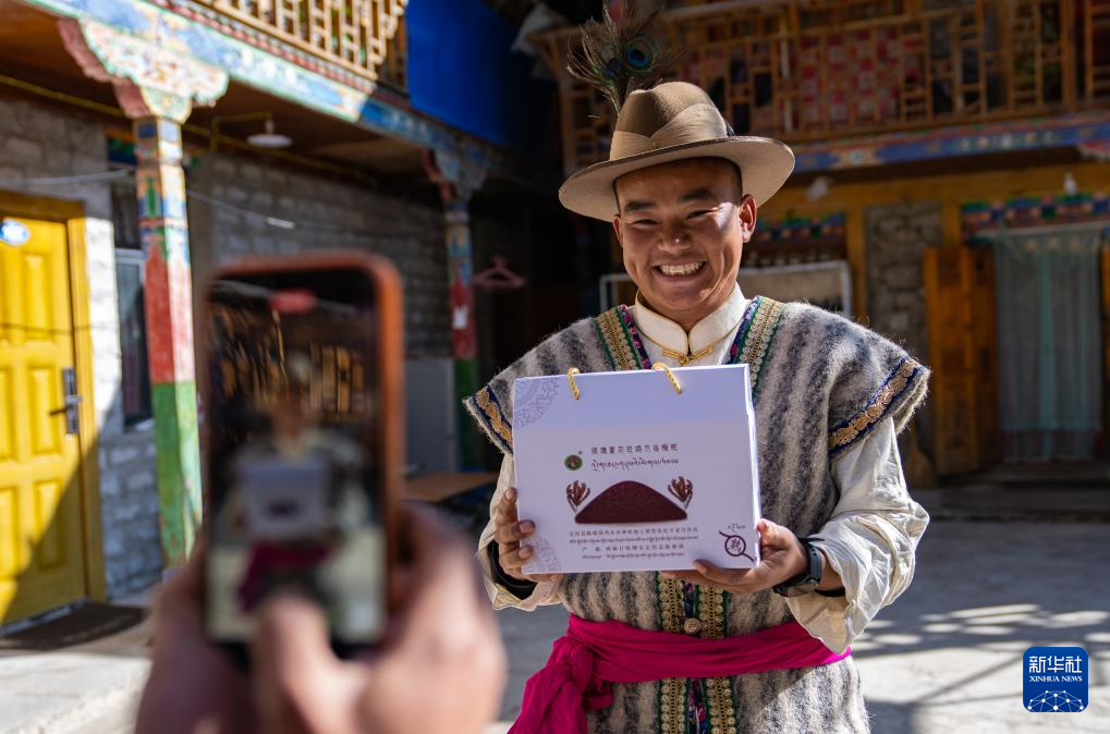 12月13日,自媒體博主夏爾巴人旦增在拍攝視頻推介當(dāng)?shù)靥禺a(chǎn)雞爪谷糌粑。