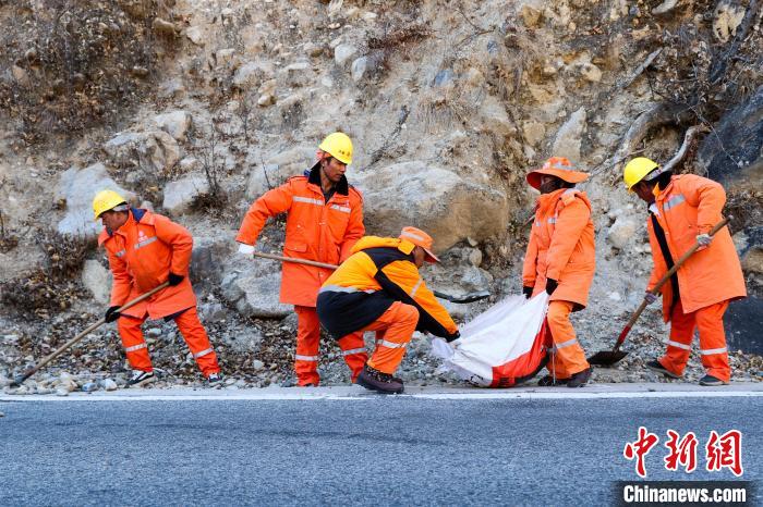 12月16日,西藏自治區(qū)林芝公路事業(yè)發(fā)展和應(yīng)急保障中心(工布江達(dá)養(yǎng)護(hù)段)道路養(yǎng)護(hù)工人及時清除川藏公路上的落石,保障道路暢通。該養(yǎng)護(hù)段擔(dān)負(fù)著川藏公路沿線工布江達(dá)縣路段的養(yǎng)護(hù)管理、應(yīng)急搶險等工作,包括路面修補(bǔ)、清理邊溝、維護(hù)交通安全設(shè)施等日常養(yǎng)護(hù)工作。圖為養(yǎng)護(hù)工人清理公路上的落石。中新社記者 王磊 攝