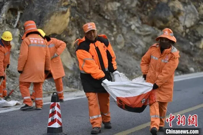 圖為道班工人清理公路上的落石。中新社記者 貢嘎來松 攝