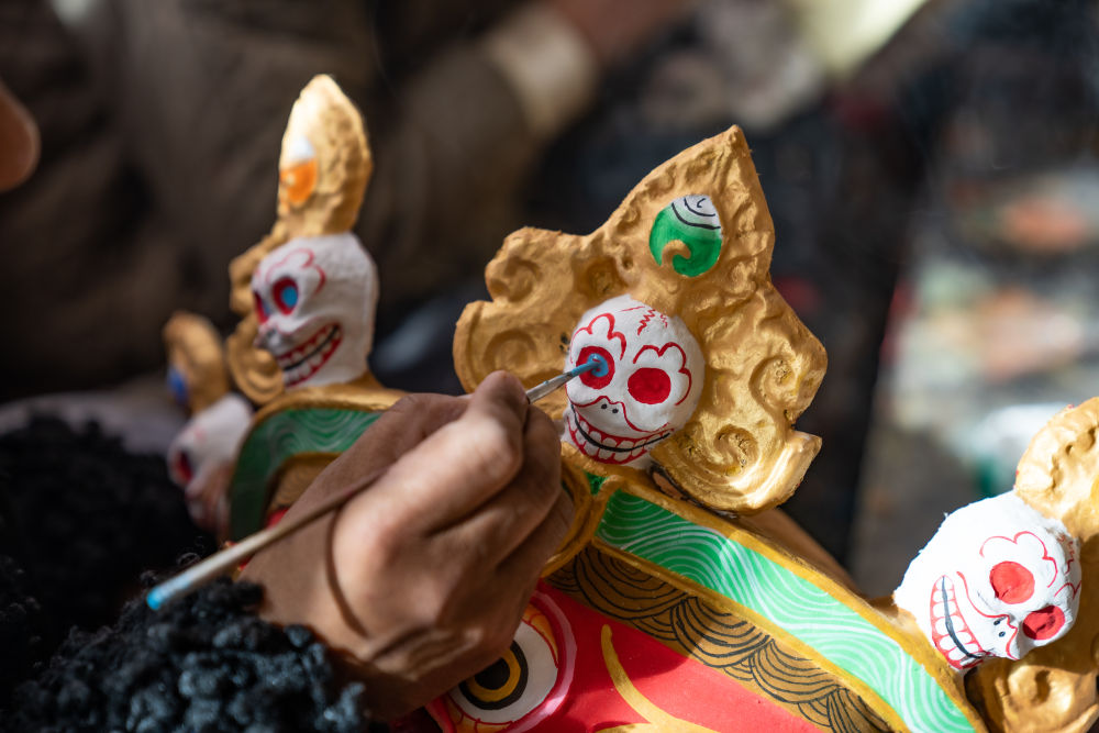 拉薩達(dá)孜區(qū)雪鄉(xiāng)民間傳統(tǒng)手工藝農(nóng)民專業(yè)合作社的面具制作工匠制作傳統(tǒng)面具。