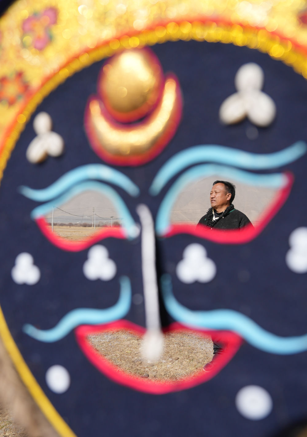 拉薩布制面具制作技藝西藏自治區(qū)級非遺傳承人西洛在合作社門前的空地上和同事一起檢查做好的西藏傳統(tǒng)面具。
