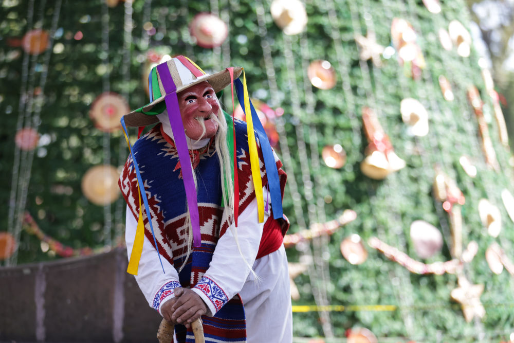面具制作在墨西哥也有著悠久的歷史,有各式各樣的面具用于各種舞蹈和慶典。舞者表演“老者之舞”時往往配戴著略顯夸張的面具,面具通常帶有皺紋、胡須和微笑的表情,借以塑造一種看似滑稽、幽默卻充滿智慧的形象。除了老人面具,舞者表演時還會穿著傳統(tǒng)的普列佩查民族服飾,包括刺繡彩色披肩、白色農(nóng)民風(fēng)格的長衫和編織草帽,整體造型鮮艷、喜慶。舞蹈表演時舞者會模仿老人的步態(tài),以滑稽的方式彎腰駝背,手持拐杖或木棍,搖搖晃晃地邁步,同時做出靈活的跳躍和旋轉(zhuǎn)動作,展現(xiàn)一種出人意料的活力與生命力。
