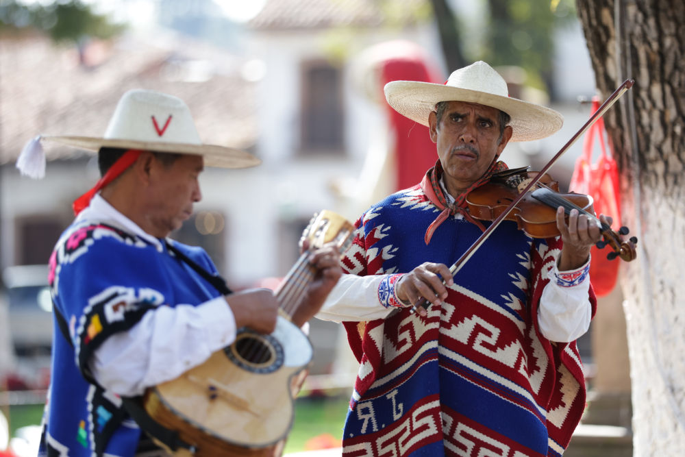 一名舞者在墨西哥米卻肯州的帕茨夸羅,藝術(shù)家演奏小提琴和吉他為“老者之舞”表演伴奏。
