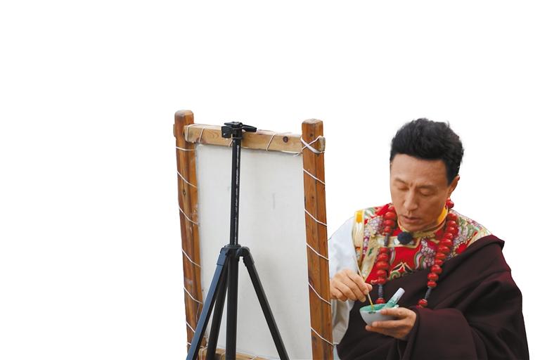 中央廣播電視總臺“乘著大巴看中國·西藏行”的嘉賓在嘎瑪鄉(xiāng)體驗(yàn)唐卡繪畫。記者 貢秋曲措 攝