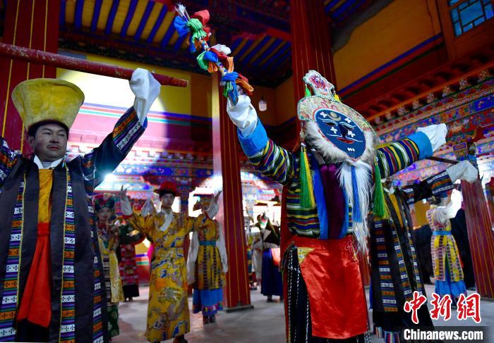 1月2日晚,一場(chǎng)視聽結(jié)合、感官沉浸的拉薩傳統(tǒng)演藝服飾秀在西藏自治區(qū)拉薩市喜德林古建大院上演。囊瑪堆諧、覺木隆藏戲等非遺的演繹,讓觀眾領(lǐng)略到拉薩深厚的文化底蘊(yùn)。圖為拉薩傳統(tǒng)演藝服飾秀演出現(xiàn)場(chǎng)。中新社記者 李林 攝