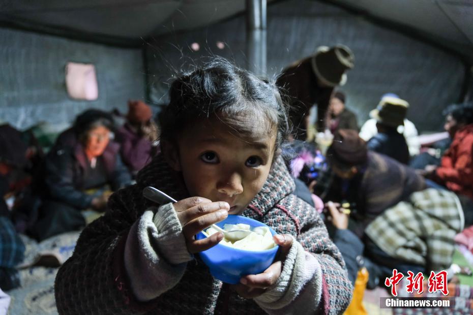 1月7日9時5分,西藏自治區(qū)日喀則市定日縣措果鄉(xiāng)附近(東經(jīng)87.45度,北緯28.50度)發(fā)生6.8級地震。日喀則市官方介紹,經(jīng)初步排查,截至當(dāng)日15時,地震共造成95人遇難,130人受傷,房屋損毀正在統(tǒng)計中。圖為日喀則拉孜縣境內(nèi)的村民在臨時搭建的帳篷里吃飯。中新社記者 江飛波 攝