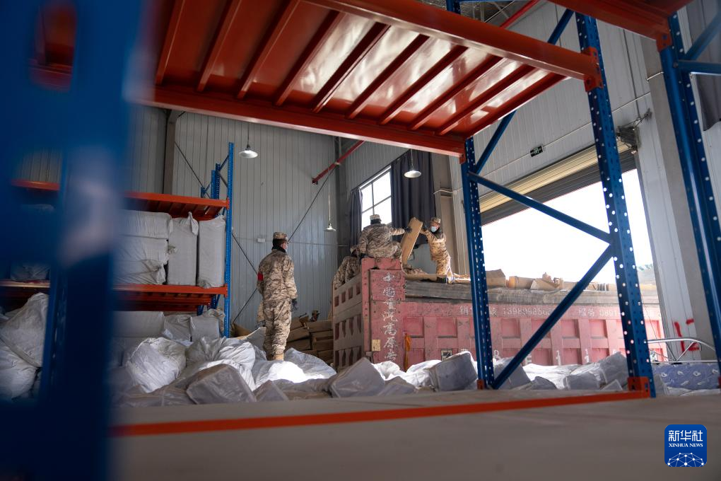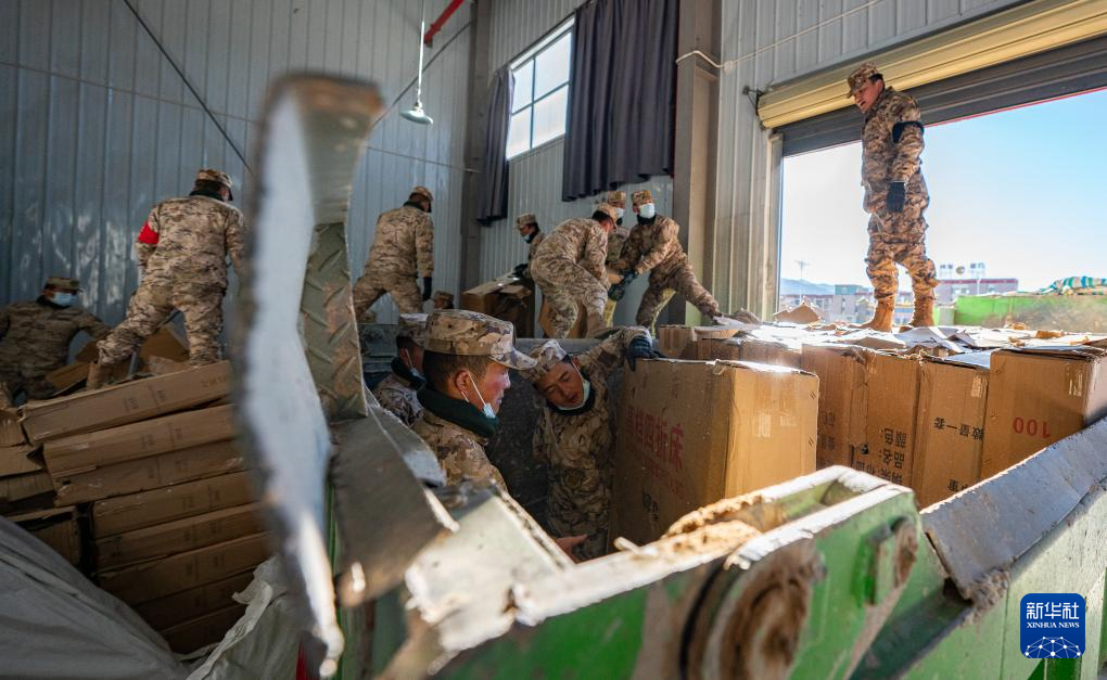 1月8日,在日喀則市經(jīng)開(kāi)區(qū)物資儲(chǔ)備倉(cāng)庫(kù),武警官兵在搬運(yùn)抗震救災(zāi)物資。
