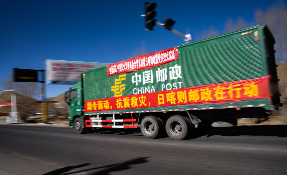 2025年1月8日,在日喀則,中國郵政的抗震救災(zāi)物資運輸車輛向震中方向駛?cè)?。新華社記者 丁增尼達(dá) 攝