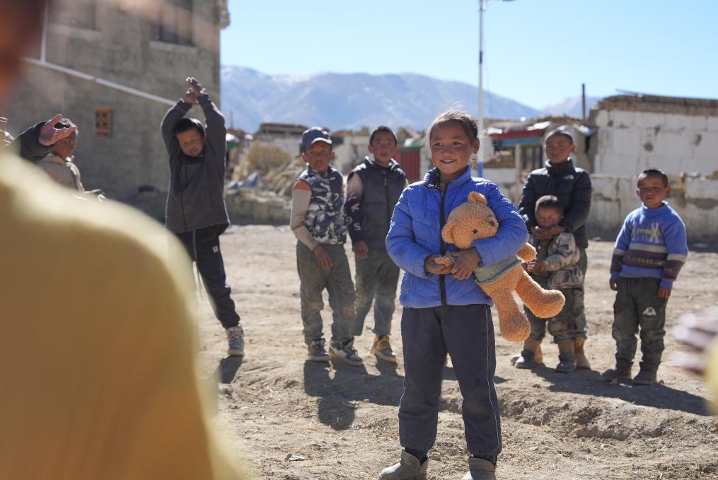 1月8日,在日喀則市定日縣措果鄉(xiāng)塘仁村地震災后安置點,西藏星光社會工作服務中心社工向孩子們贈送玩偶熊,并給他們表演節(jié)目。