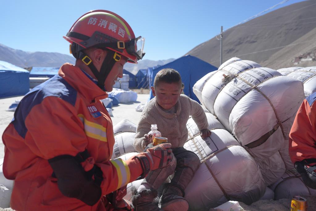 1月7日,在定日縣古榮村集中安置點,解放軍為受災群眾做飯。