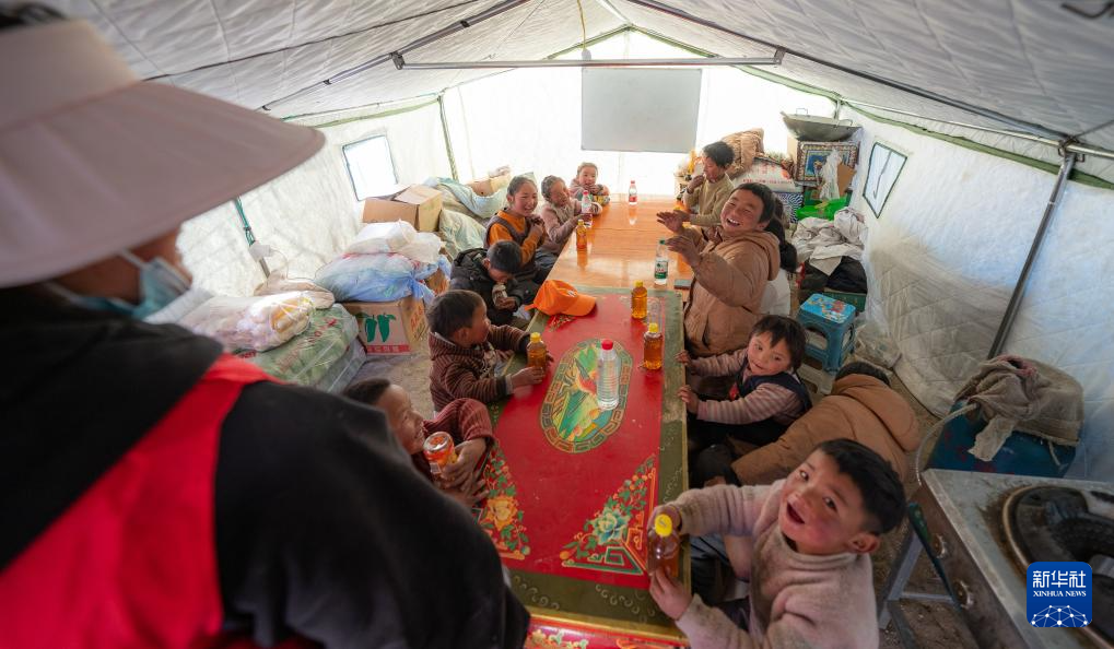 1月10日,在定結(jié)縣郭加鄉(xiāng)乃村安置點,孩子們在學(xué)生臨時學(xué)習(xí)區(qū)做游戲。新華社記者 丁增尼達 攝