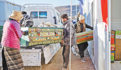 1月11日,西藏定日縣曲洛鄉(xiāng)措昂村,首批入住活動(dòng)板房的村民正在搬運(yùn)物品,為入住做準(zhǔn)備。記者 張武軍攝