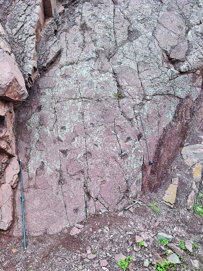 西藏昌都位于青藏高原東部,據(jù)介紹,此研究區(qū)的侏羅紀地層最大厚度超過4800米,巨大的沉積厚度促進了大量化石的發(fā)現(xiàn),其中就包括恐龍足跡化石。2023年7月,中國地質調查局自然資源實物地質資料中心項目組于昌都開展工作時,在凍多村一段鄉(xiāng)村道路兩側的石壁上發(fā)現(xiàn)了疑似爬行動物腳印,隨即與遺跡學專家合作組成考察隊開展研究。該足跡化石點頂部為灰?guī)r,由紫紅色砂巖間夾頁巖、黏土巖組成,含有植物化石、遺跡化石和少許腕足、介形類和海百合莖等化石,總體屬于海陸交互環(huán)境??疾礻犜诳铸堊阚E所在層面與相鄰層面還發(fā)現(xiàn)了如古藻跡、石針跡等遺跡,這些發(fā)現(xiàn)代表這個地方曾是淺水環(huán)境。因此,研究證明,良好的環(huán)境和豐沛的水資源吸引了恐龍等動物在此活動,并留下豐富的足跡化石。