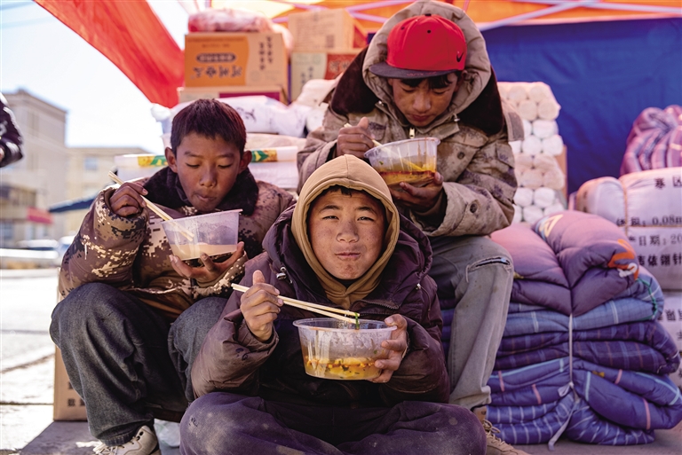 在長所鄉(xiāng)森嘎村安置點,來自定日縣崗嘎鎮(zhèn)的普桑和其他3名村民正在給受災群眾與救援人員分發(fā)“巴突”(藏語音譯,意為面疙瘩)。“今天上午我們做的‘強歸’(藏語音譯,意為煮青稞酒和糌粑),中午做的‘巴突’,這是我們的傳統(tǒng)美食,吃了全身都會暖乎乎的。大家互幫互助,一切都會慢慢好起來的。”普桑說。