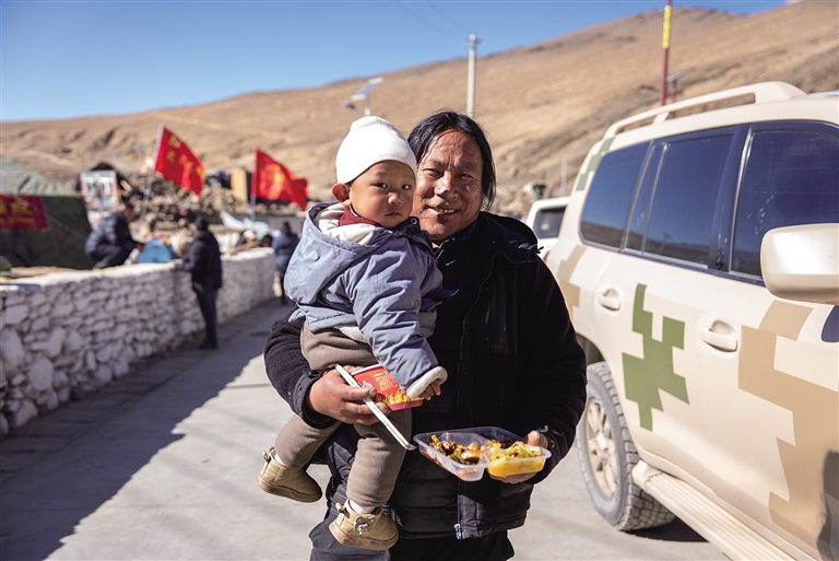 定日縣長所鄉(xiāng)古榮村的受災群眾收到熱騰騰的飯菜。