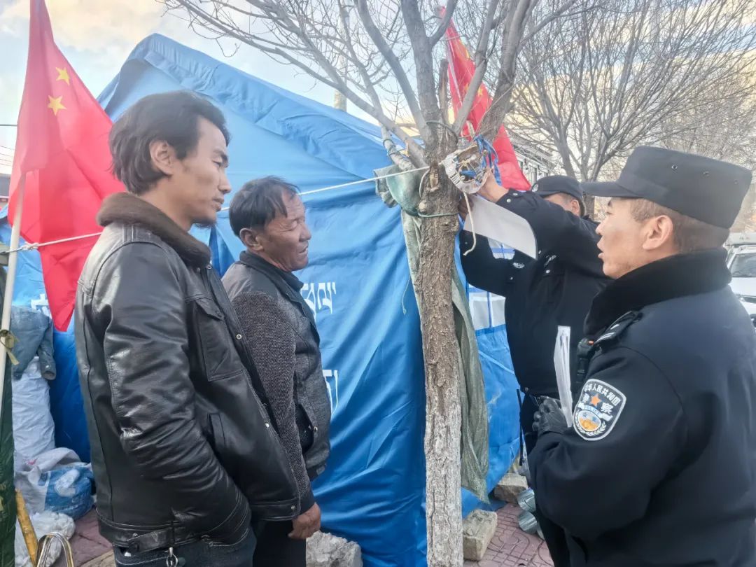 災(zāi)情如令,責(zé)任重于泰山。在這場爭分奪秒與時間賽跑的抗震救災(zāi)戰(zhàn)斗中,拉孜公安始終堅定地與群眾并肩同行,以“伴隨式”守護的帳篷警務(wù)室,為受災(zāi)群眾筑牢安全防線。一頂頂 “帳篷警務(wù)室” 以迅雷不及掩耳之勢搭建完成,恰似一座座堅固的堡壘;一面面鮮艷的黨旗在廢墟之上獵獵作響,傲然飄揚,它們共同構(gòu)成了守護受災(zāi)群眾生命財產(chǎn)安全的鋼鐵長城,成為抗震救災(zāi)戰(zhàn)場上一道令人動容的亮麗風(fēng)景線 。