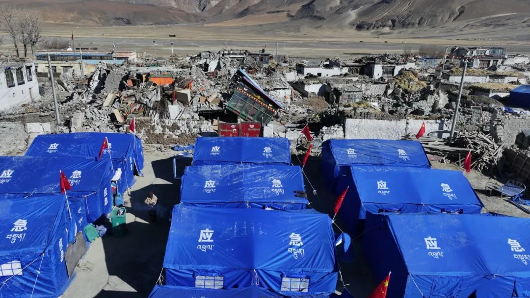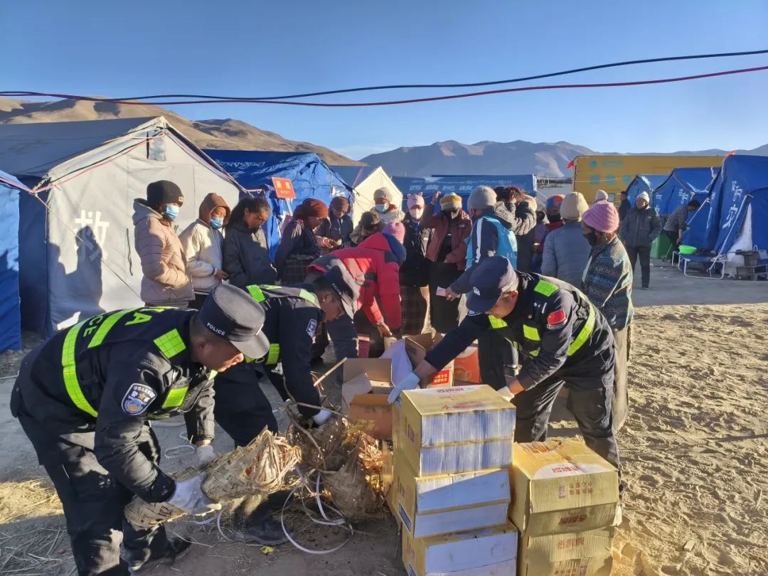 圖為在日喀則市定日縣長所鄉(xiāng)嘎布村安置點(diǎn),日喀則邊境管理支隊(duì)嘎布村“帳篷警務(wù)室”民警幫助群眾卸載救災(zāi)物資。貢嘎齊平 攝