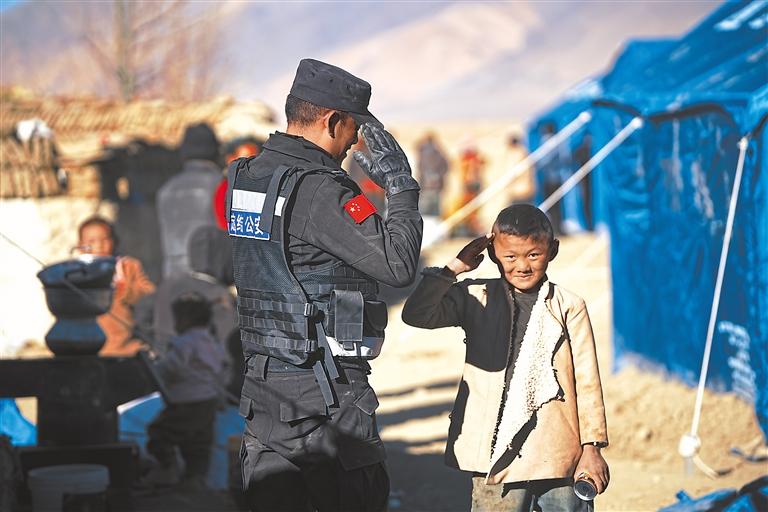 “照片上的這位民警是我們的同事,叫普次仁。1月9日,他在村里的臨時安置點巡邏的時候,看到一個小男孩,便將自己手中的飲料遞給他。沒想到這個叫達瓦扎西的小男孩很認真地給他敬了個禮。”定結(jié)縣公安局應(yīng)急救援小分隊隊員高靜說,“照片是我在定日縣措果鄉(xiāng)吉翁村拍的?!?/p>