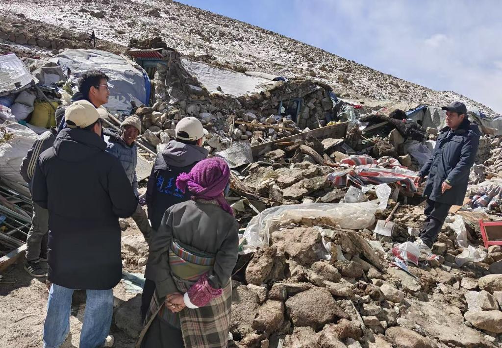 這次是政府工作人員第二次來到該村,核實災(zāi)情。珠桑一行人一到村里,開始查看房屋和羊圈倒塌廢墟,詢問牲畜傷亡和物資受災(zāi)情況。