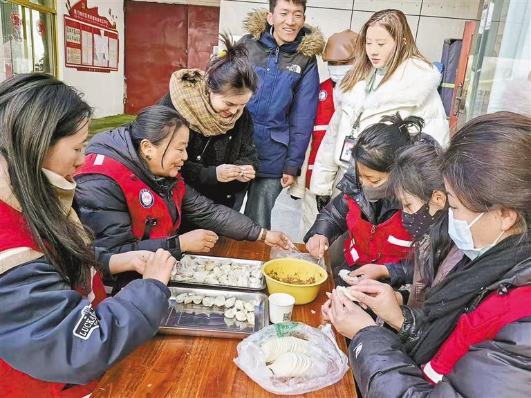 上圖:1月27日,拉薩市城關區(qū)策門林社區(qū)工作人員與居民一起包餃子。