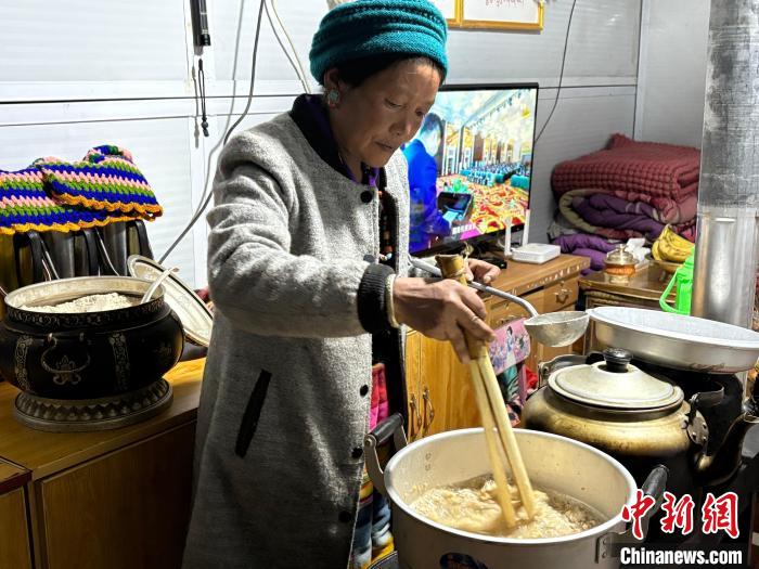 圖為日喀則市拉孜縣錫欽鄉(xiāng)錫欽村安置板房內(nèi),村民瓊拉在煮大年初一的“羌鍋”。何金龍 攝