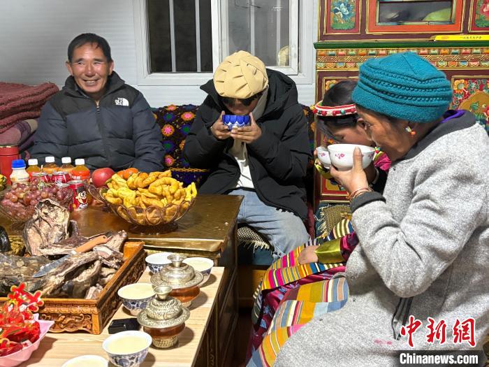 圖為日喀則市拉孜縣錫欽鄉(xiāng)錫欽村安置板房內(nèi),吳子周一家人在喝大年初一的“羌鍋”。何金龍 攝