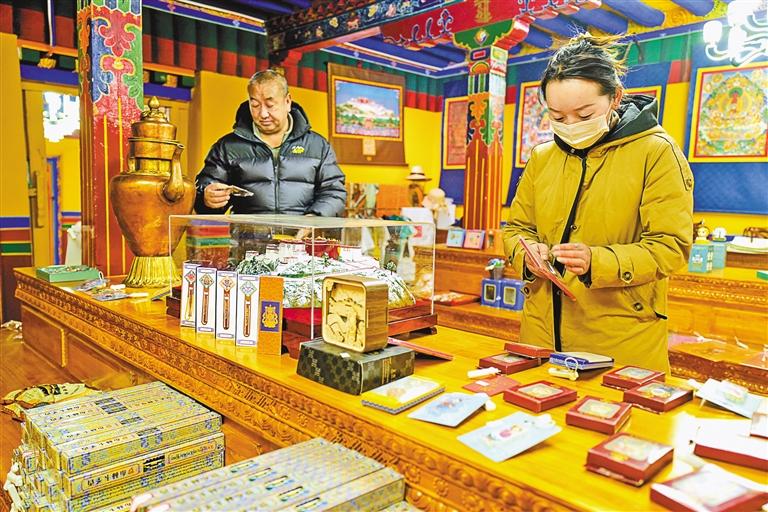 圖為市民在羅布林卡文創(chuàng)精品館選購(gòu)特色非遺文創(chuàng)產(chǎn)品。記者 丹增群培 攝