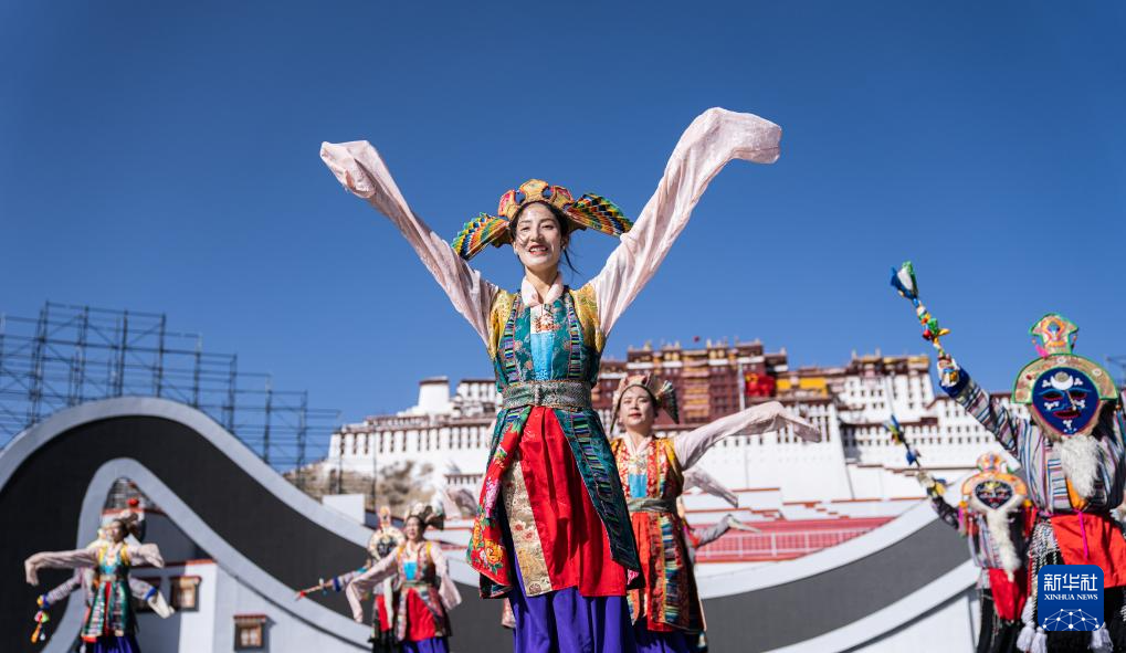 2月2日,演員在布達(dá)拉宮廣場演出。新華社記者 丁增尼達(dá) 攝
