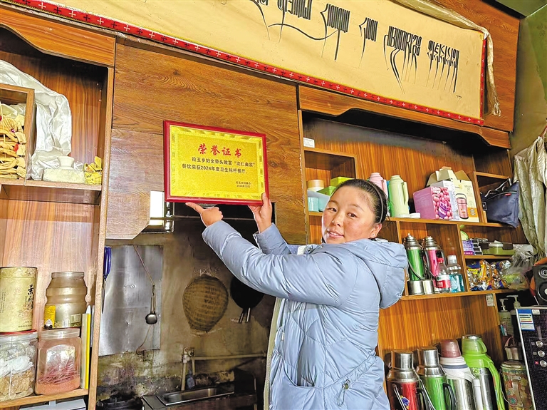 圖為次仁曲宗在門店懸掛“衛(wèi)生標(biāo)桿”獎牌。記者 孫開遠(yuǎn) 索朗曲珍 攝
