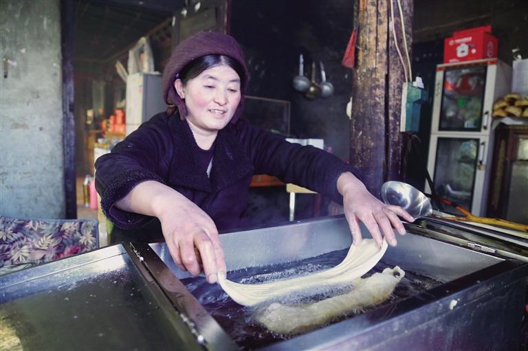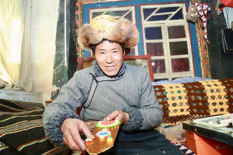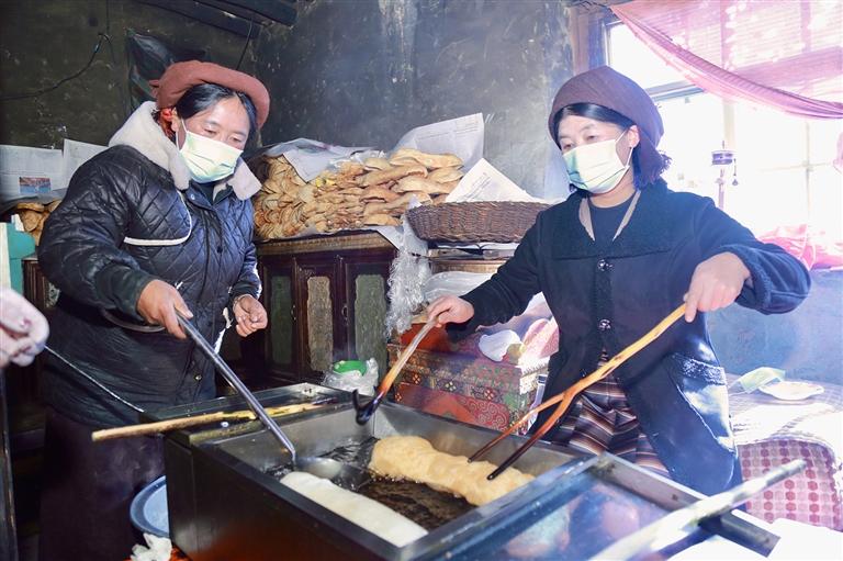 “德卡”,作為傳統(tǒng)藏式點心“卡塞”的一種,在藏歷新年的年貨清單里占據(jù)著不可或缺的位置。每到藏歷新年前夕,旦索朗一家便進入了一年中最忙碌的時段——經(jīng)營起制作和售賣卡塞的生意。旦索朗回憶起小時候的新年,感慨萬分:“小時候過年,家家戶戶都自己炸卡塞,那時候,整個村子都被卡塞的濃香包圍著。現(xiàn)在生活條件好了,很多人覺得在外購買德卡更方便省事,這也給我們帶來了商機。我們做炸德卡的生意已經(jīng)6年了,一直都很受歡迎,還帶動了6名村民一起參與,增加了大家的收入。”