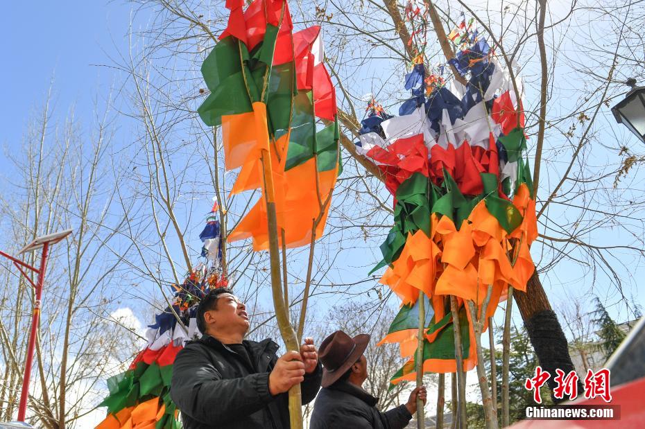 臨近藏歷新年,2月16日,在西藏拉薩街頭,農(nóng)牧民正縫制五彩經(jīng)幡樹。五彩經(jīng)幡樹是藏族民眾在藏歷新年前必備的年貨之一。藏歷新年期間,藏族民眾會選擇一個良辰吉日,為自家的房頂更換五彩經(jīng)幡樹,祈求新的一年里五谷豐登,吉祥如意。圖為2月16日,拉薩市民正在挑選購買五彩經(jīng)幡樹。貢確 攝