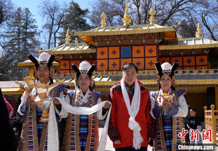 圖為歡迎儀式現(xiàn)場(chǎng),香港游客在羅布林卡與身著拉薩傳統(tǒng)服飾的工作人員合影留念。中新社記者 李林 攝
