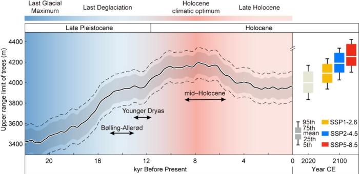 研究結(jié)果顯示,青藏高原平均樹(shù)線海拔在末次冰期最低(約3426米);全新世大暖期(距今約8000年)達(dá)到最高(約4187米),比當(dāng)前的平均樹(shù)線(約4009米)高約180米。冰期與間冰期樹(shù)線波動(dòng)幅度高達(dá)850米,導(dǎo)致間冰期高山特有物種棲息地面積僅為冰盛期的約50%。