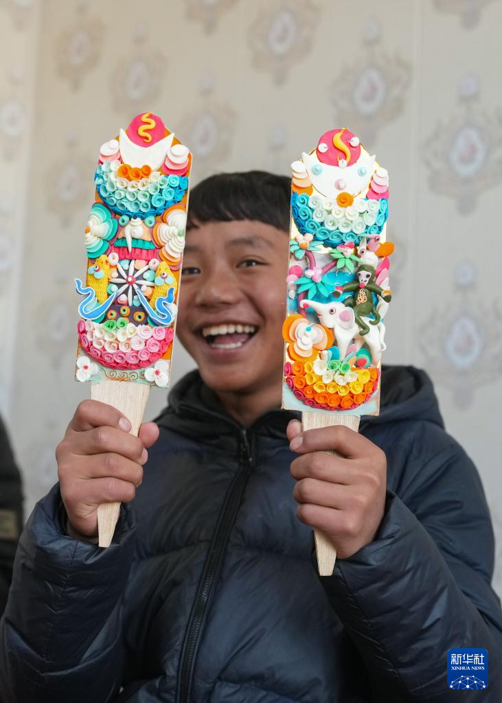 在拉薩市老城區(qū),小學(xué)徒在展示剛剛做好的一對酥油花(2月25日攝)。新華社記者 晉美多吉 攝