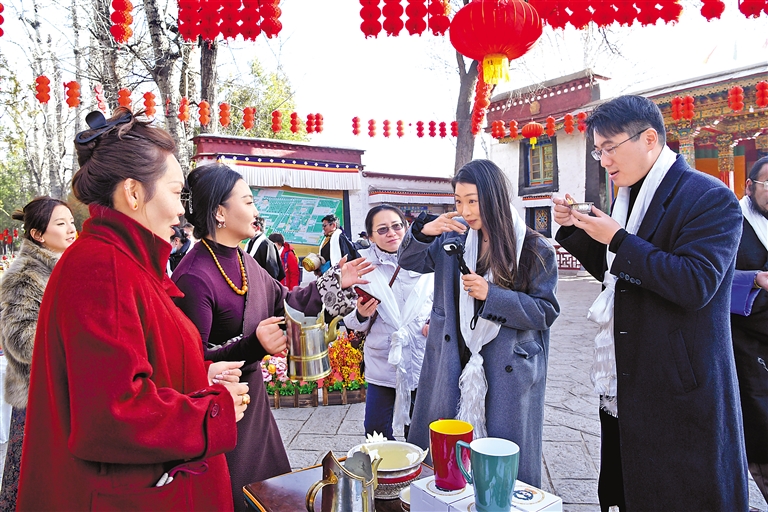隨著一聲聲“扎西德勒!”“新年快樂(lè)!”的祝福語(yǔ)響起,身著盛裝的工作人員站在切瑪盒旁邊,熱情地教游客吃“切瑪”。“切瑪”盒里滿(mǎn)滿(mǎn)的青稞粒和糌粑,再加上金燦燦的酥油花和染成紅綠兩色的“羅薩梅朵”麥穗的裝點(diǎn),象征著五谷豐登、福澤綿長(zhǎng)。來(lái)自廣東的游客張女士一家是專(zhuān)程趕來(lái)過(guò)藏歷新年的,想來(lái)體驗(yàn)不同年味兒的她輕捏一撮切瑪撒向空中:“愿我們?nèi)医】灯桨?,也祝祖?guó)繁榮昌盛!”