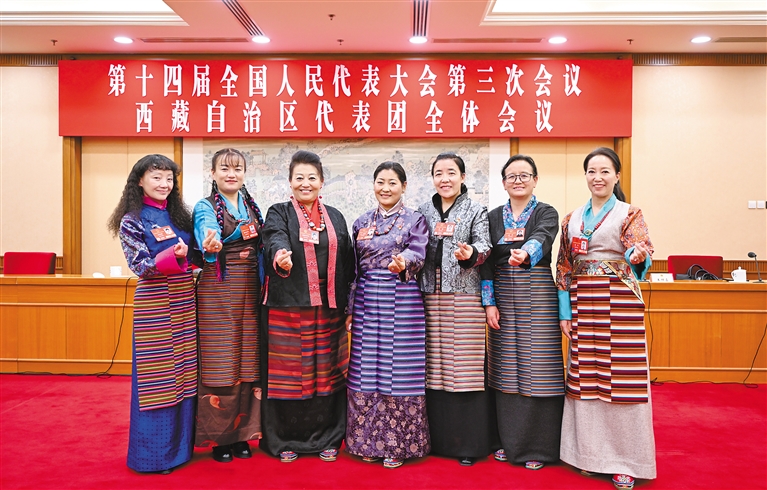 圖為西藏全國人大代表中的“七朵金花”在西藏代表團(tuán)主會場合影留念,并祝福全區(qū)婦女同胞“三八”國際勞動?jì)D女節(jié)快樂。記者 旦增西旦 攝