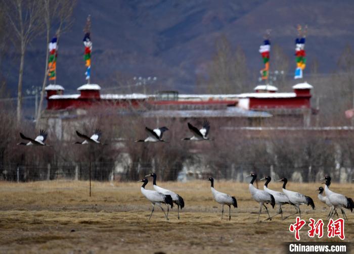 圖為3月8日,西藏拉薩林周縣黑頸鶴保護區(qū),黑頸鶴在田間覓食、嬉戲。中新社記者 李林 攝
