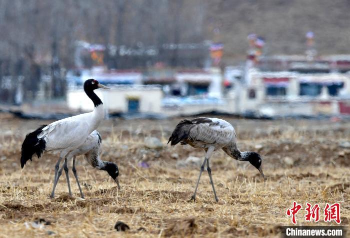 圖為3月8日,西藏拉薩林周縣黑頸鶴保護區(qū),黑頸鶴在田間覓食。中新社記者 李林 攝