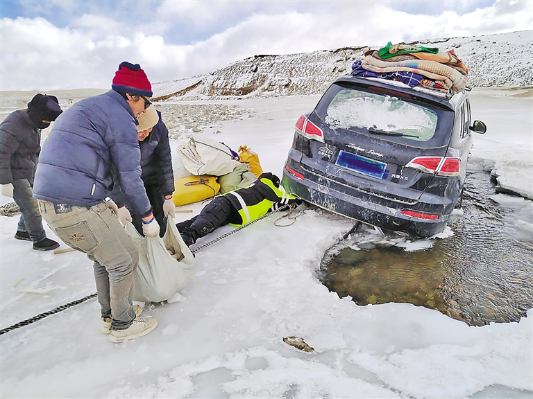 2月16日,聶榮縣公安局桑榮鄉(xiāng)派出所接到轄區(qū)群眾報(bào)警求助,稱其在前往冬季牧場(chǎng)途中,車輛不慎陷入結(jié)冰河道,無(wú)法自行脫困。接警后,派出所立即組織警力攜帶救援工具第一時(shí)間趕到現(xiàn)場(chǎng),只見,被困車輛右側(cè)輪胎陷入冰層,動(dòng)彈不得。對(duì)此,民(輔)警迅速采取救援措施,冒著嚴(yán)寒使用鐵鍬鑿開并清理輪胎周圍冰層,俯臥在冰面上,為車輛綁上拖車?yán)K,采取車?yán)送频确绞?,全力幫助車輛脫困。最終,經(jīng)過五個(gè)多小時(shí)的不懈努力,成功將被困車輛拖拽至安全地帶。