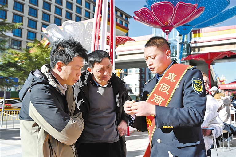 圖為桑珠孜區(qū)市場監(jiān)管局投訴舉報中心負(fù)責(zé)人李良友(右)向市民講解商品真假辨別方法。 記者 扎西頓珠 攝