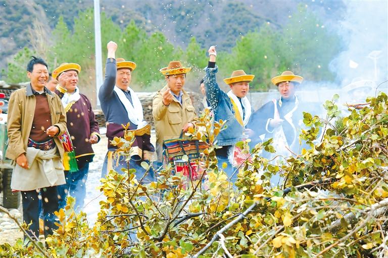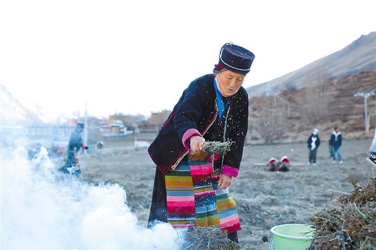 林芝市工布江達(dá)縣工布江達(dá)鎮(zhèn)阿沛村村民手捏糌粑撒向點(diǎn)燃的青岡樹(shù)堆,祈求風(fēng)調(diào)雨順。記者 謝筱純 攝